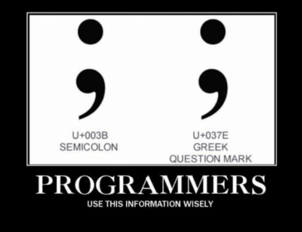 But the rust compiler explainserror: unknown start of token: \u{37e} help: Unicode character ';' (Greek Question Mark) looks like ';' (Semicolon), but it is not``` what a killjoy.But the rust compiler explains