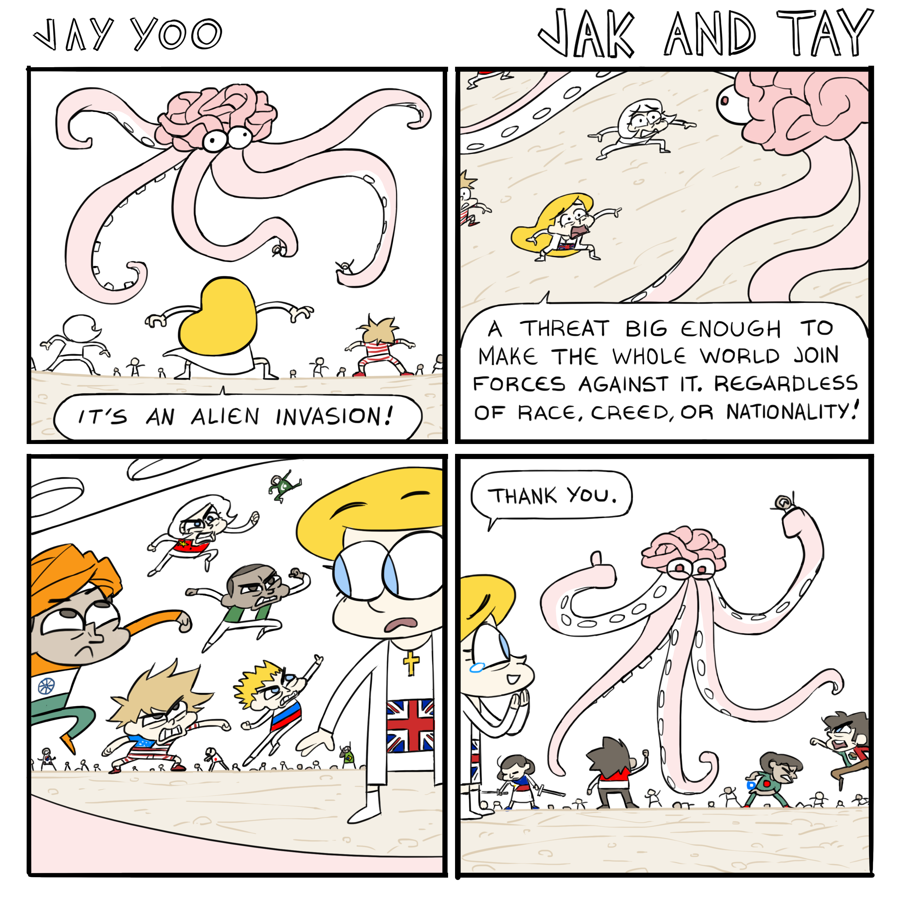 Wait, where’s the part where Joe Rogan joins forces with the alien after “doing his own research”?