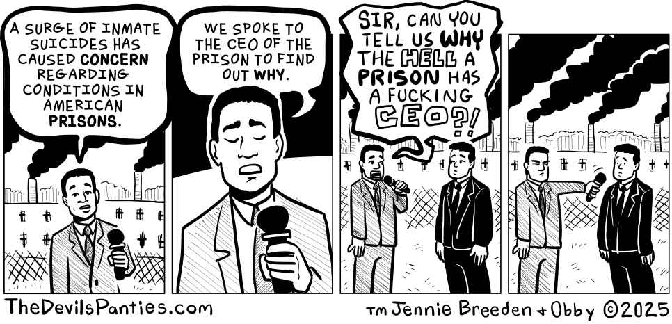This comic is dumb. That CEO would have a prepared and well rehearsed response to that question with a bunch of big words and some dog whistle to keeping immigrants from raping your daughters. “The free market can perform the function of rehabilitation better than some bloated bureaucracy. With state-run prisons, inmates of all kinds are released early because there isn’t enough room, regardless of the nature of their crime. This way, you and your family can sleep safely, can attend little league games, and walk down your streets without having to worry what is hiding just around the corner.”