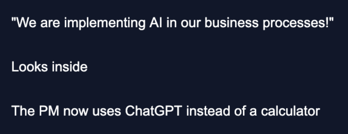 My wife had an AI “pro” come into her company to talk about revolutionizing her business. Bro just talked about asking chatgpt everything. Got a problem from your boss? Chatgpt! Excel woes? Chatgpt!