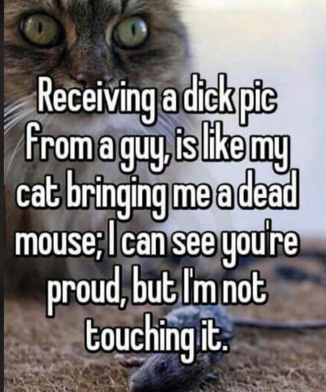 - Well actually - cats bring you mice because they think you are just a big cat but you’re a shit hunter. so they kinda care, in a somewhat disgusting way. In contrast people who send dick pics care mostly about themselves and are disgusting. - That’s a myth and a bizarre misinterpretation of how ethology studies work. It’s incredibly bothersome to still see this being repeated around. - I get it sounds cute and the media loved posting about it, but no, your cat does not see you as a big awkward cat that can’t hunt. - they are however actually quite social animals and they’re clearly bringing it to you, so it’s a good bet they want to share, not because they think you’re incompetent but just because family helps each other. - “hello human i love you very much, let’s eat this mole together :3” - Absolutely, you’re right.