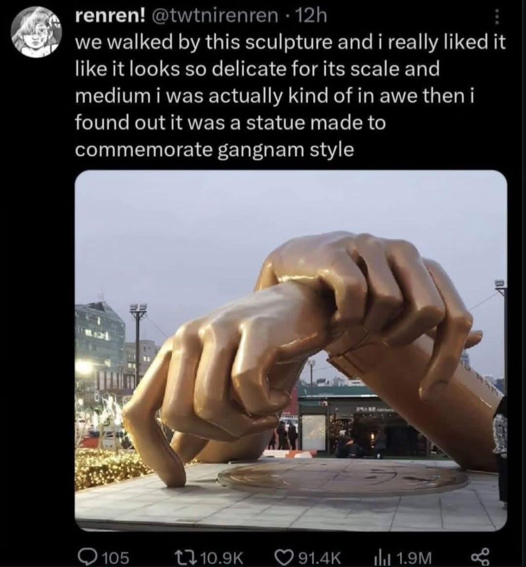- Gangnam style made me prefer North Korea to South Korea. No country devoted to the common good could ever unleash such cultural carnage upon the world. - Jokes, but I do hate gangnam style. - It was a fucking banger and a true classic of this millennium’s tween years you tasteless, joyless, spork sharpener. - addendum: the lil “discourse” below this comment is 🍫🍿🥤 - I dont believe one could be a millenial tween in 2012 - Millennium as in 2000-3000 not millennial as the generation. - Psst. 2001-3000 - Of course, I never wrote anything different 😉