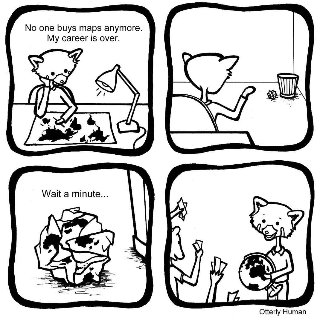 Alt Text: 1 Guy: No one buys maps anymore. My career is over. 2 crumples up map and throws it 3 Guy, looking at crumpled up map: Wait a minute… 4 Guy selling globes