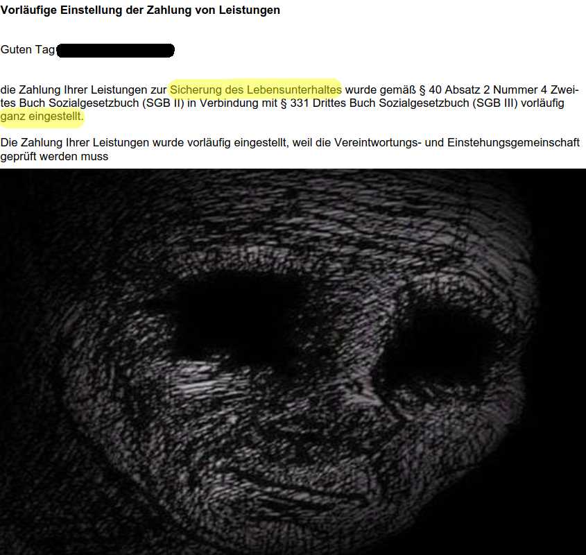 In dem Fall machte es besonders viel Sinn, wenn man Leistungen komplett einstellt und nicht etwa auf den Gedanken kommt erst mal einen vorläufigen Bescheid auszustellen. (Entschuldigung, ich hatte nicht genug Schlaf und bin gerade etwas zynisch/sarkastisch unterwegs)