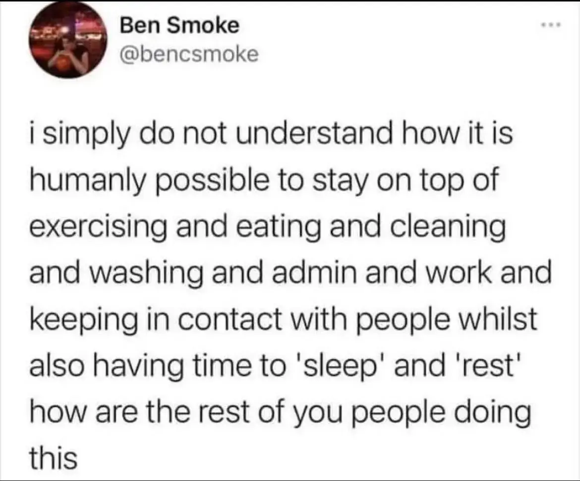 Split the house chores between a partner, meme and doom scroll social media while at work, exercise at home or nearby. Don’t have the energy to keep in contact with most people all that often though. Get what sleep I can.