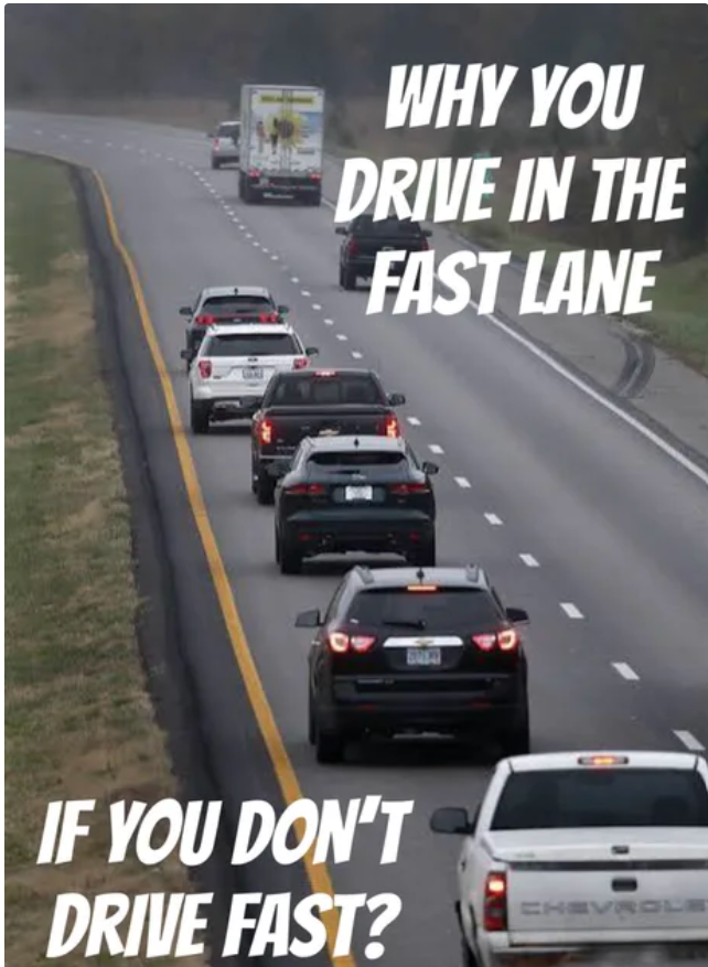 My ex wife was a left lane camper. She would point to a semi a mile ahead and say… “I’m going faster than them… Why should I love over?” Meanwhile cars are flashing lights and passing her on the right…